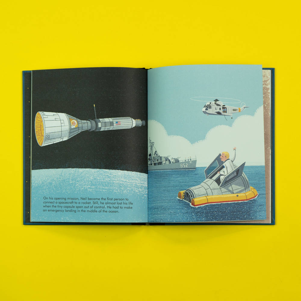 Little Neil’s dreams took flight when he rode on his first airplane as a child. After studying aeronautical engineering and time spent in the navy, he became a pilot. From there, he was selected to take a trip to where no human had gone before – the moon! Along with his team, Buzz and Mike, he was the captain of the Apollo 11. And Neil took a giant step for humankind as the first person to ever step onto the surface of the moon.This inspiring book features stylish and quirky illustrations and extra facts at the back, including a biographical timeline with historical photos and a detailed profile of the legendary astronaut.