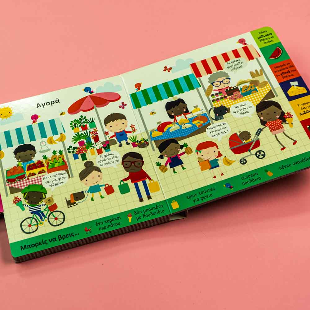 Κάθε σελίδα κρύβει πολλά διαφορετικά στοιχεία για να ανακαλύψουν τα παιδιά. Μέσα από υπέροχες εικόνες και πάμπολλα στοιχεία προς αναζήτηση και εύρεση τα μικρά παιδιά θα λατρέψουν αυτό το διασκεδαστικό βιβλίο πρώτης μάθησης!